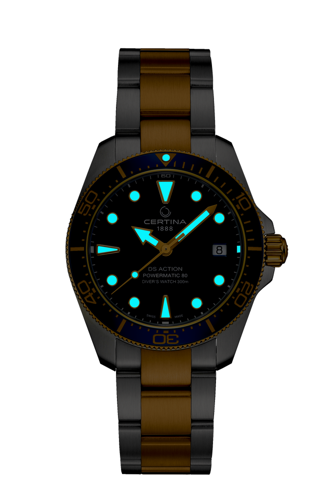 Super-LumiNova® (SLN) is a luminescent material with phosphorescent properties. In the dark, the SLN type BG W9 used by Certina emits the light stored as a blue shimmer. SLN does not damage your health in any way and is used in coatings on hands, indices and bezels. It progressively loses its phosphorescence in darkness, but automatically regains it under light.