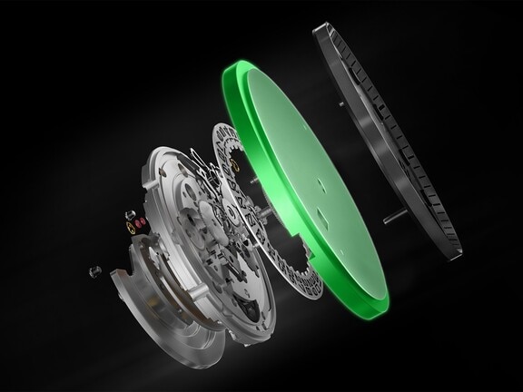 To prevent the dial from deforming or slipping in the case if knocked, an ultra-thin metal plate has been positioned between the dial and the movement to secure the two elements together for more stability.